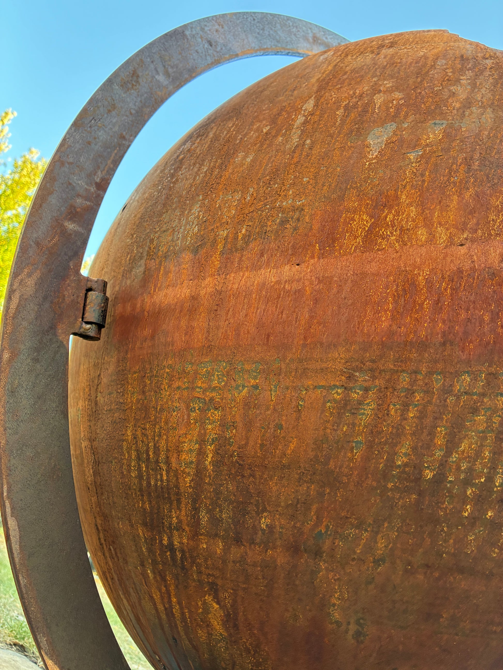 Constructed from two 36” diameter hemispheres made of 1/4” thick mild steel, the globe rests on a 3/8” thick custom steel frame and pipe base. Heavy-duty pipe sleeves at all pivot points ensure smooth rotation and lasting durability.